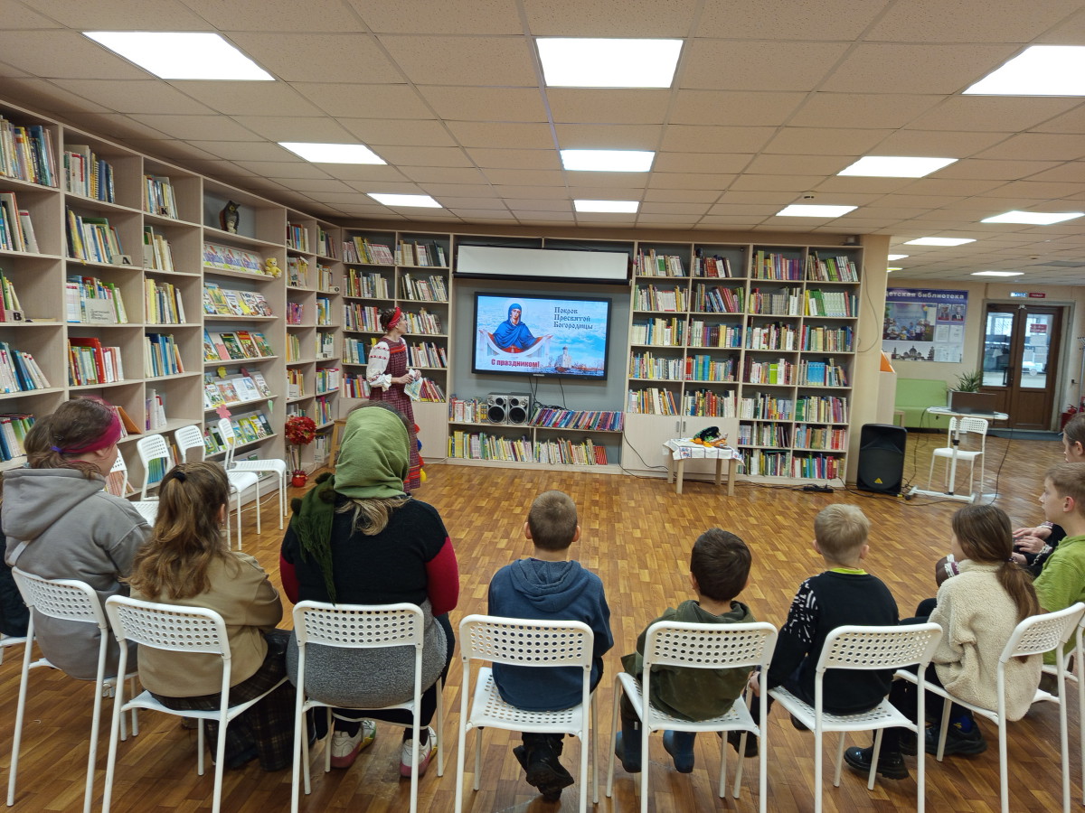 В рамках Воскресных семейных чтений Детскую библиотеку №1 библиотеку посетили воспитанники Воскресной школы при храме в честь Архангела Михаила. Ребята вместе с родителями приняли участие в познавательном фольклорном празднике «Посиделки на Покров».