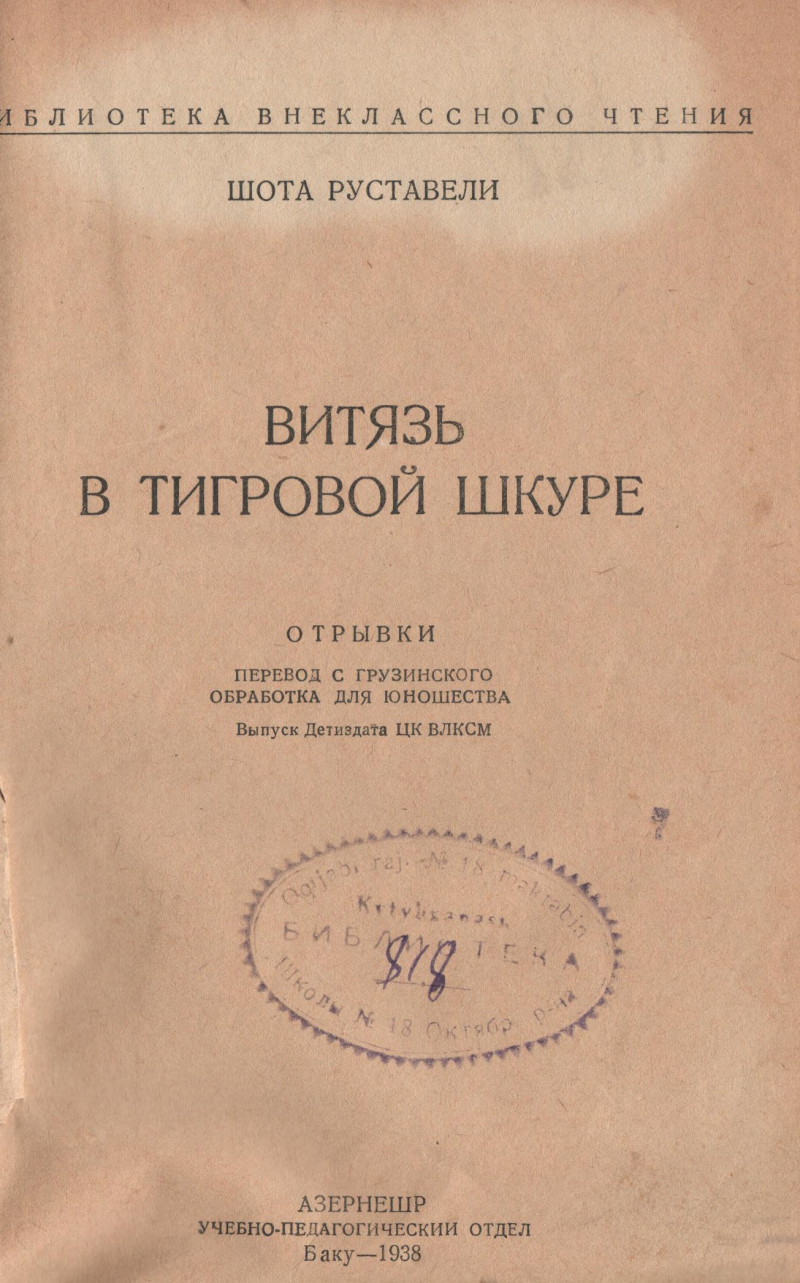 В серии «Библиотека внеклассного чтения» в 1938 году в Баку была издана книга «Витязь в тигровой шкуре».