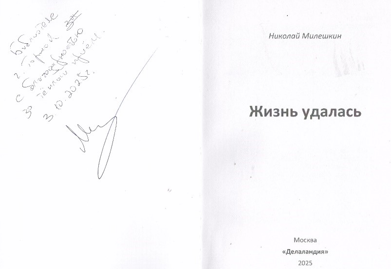 В завершение обзора представляем книгу нашего гостя, поэта и критика Николая Милешкина «Жизнь удалась». - Москва: Делаландия, 2025. - 84 с. С дарственной надписью : «Библиотеке г.Торжка с благодарностью за тёплый приём. 3.10.2025г.»
